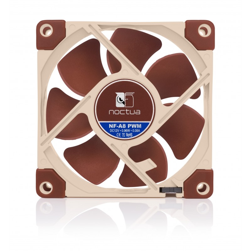 Noctua NF-A8 PWM. Type: Ventilateur, Diamètre du ventilateur: 8 cm, Vitesse de rotation (min): 450 tr/min, Vitesse de rotation (max): 2200 tr/min, Flux d'air: 55,5 m³/h. Tension: 12 V. Largeur: 80 mm, Profondeur: 80 mm, Hauteur: 25 mm. Couleur du produit: Beige, Marron