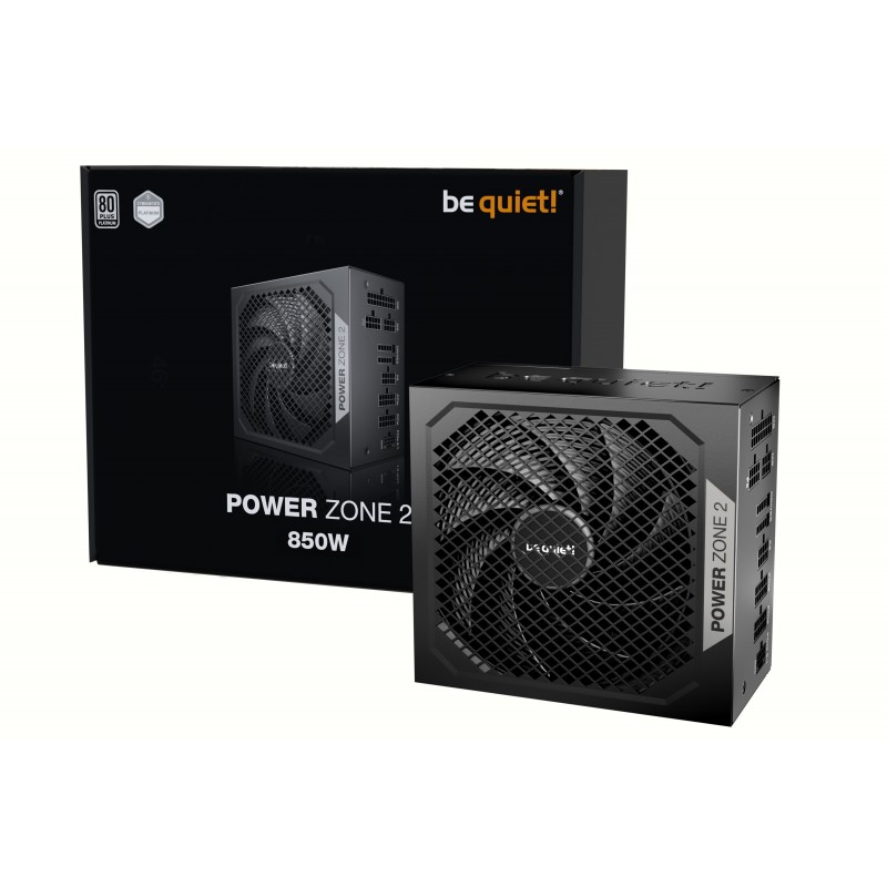 be quiet! POWER ZONE 2 850 W | Alimentation ATX 3.1, 80 Plus Platinum. Puissance totale: 850 W, Tension d'entrée AC: 100 - 240 V, Puissance de crête: 920 W. Connecteur de la carte mère: 20+4 pin ATX, Longueur de câble d'alimentation de carte-mère: 60 cm, Longueur du câble d'alimentation SATA: 550,700,850,1000 mm. Utilité: PC, Facteur de forme de l'unité d'alimentation: ATX, Certification 80 PLUS: 80 PLUS Platinum. Couleur du produit: Noir, Type de refroidissement: Actif, Diamètre du ventilateur: 14 cm. Certificats de conformité: BSMI, CB, CCC, CE, Federal Communications Commission (FCC), RCM, RoHS, TÜV mark, UKCA, WEEE