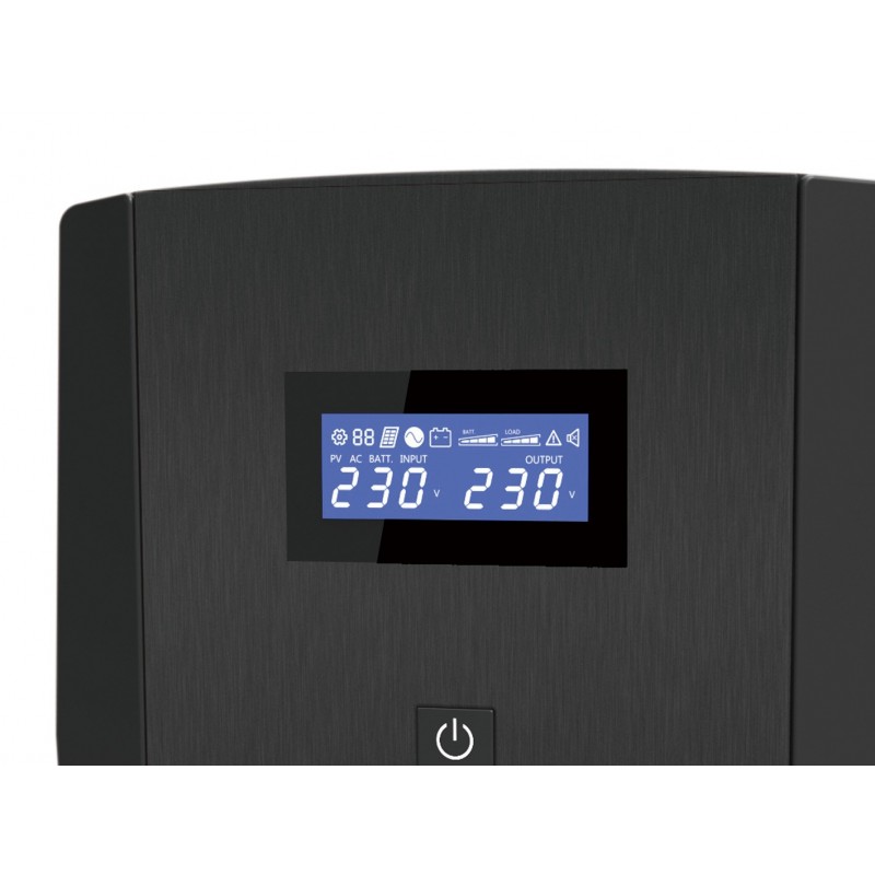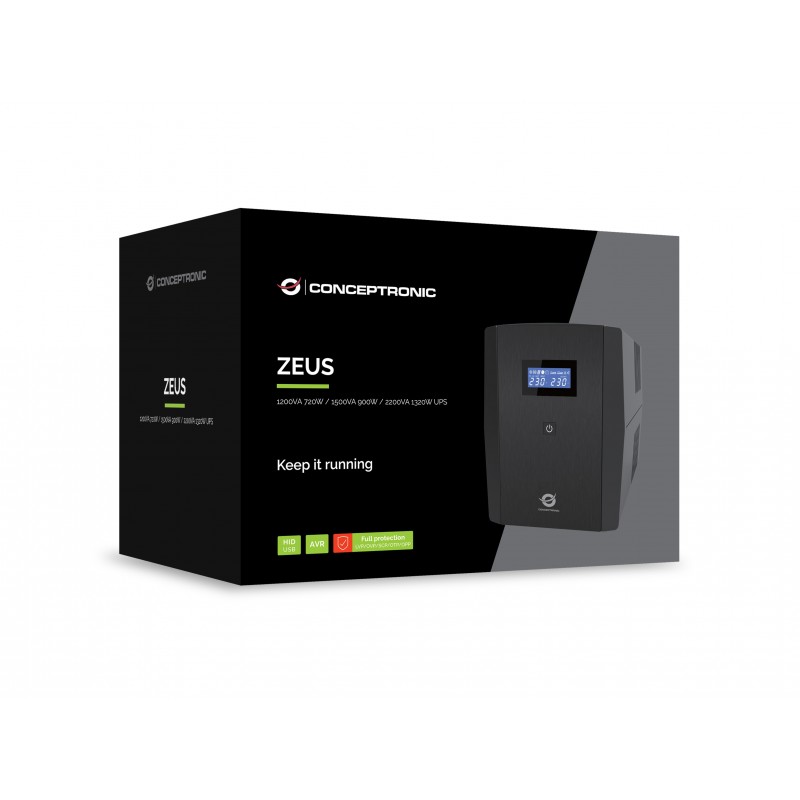 Conceptronic ZEUS04G. Topologie UPS: Interactivité de ligne, capacité de la puissance de sortie: 2,2 kVA, Puissance de sortie: 1320 W. Types de sortie AC: Type G (BS 1363), Nombre de prises en sortie: 4 sortie(s) CA, Type de port USB: USB Type-B. Technologie batterie: Plomb-Acide, Capacité de la batterie: 18 Ah, Tension des piles: 24 V. Format: Bureau, Couleur du produit: Noir, Type d'écran: LCD. Certificats de conformité: CE, RoHS