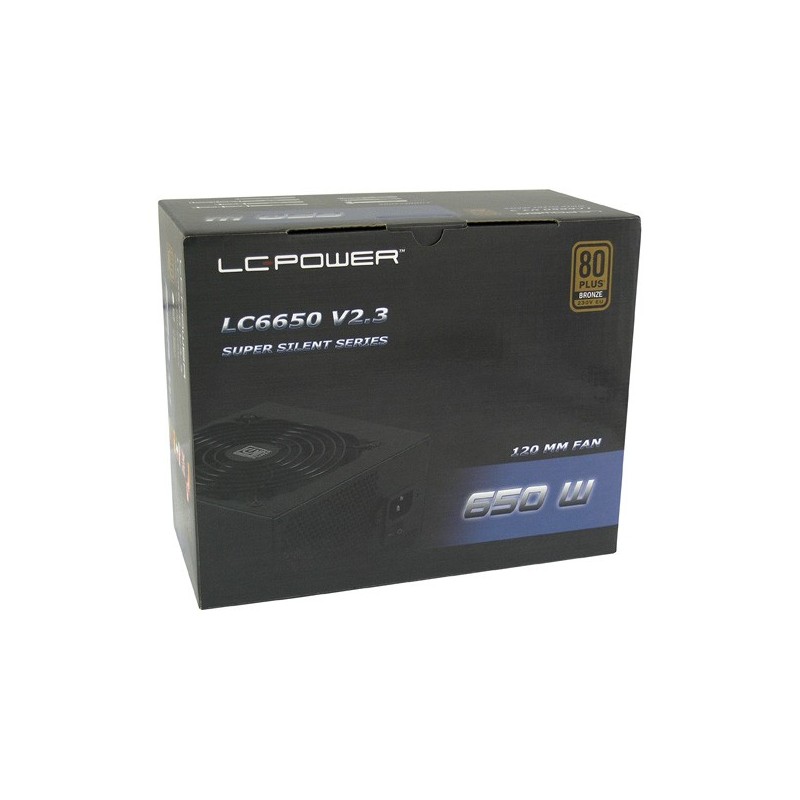 LC-Power LC6650 V2.3. Puissance totale: 650 W, Tension d'entrée AC: 230 V, Fréquence d'entrée AC: 47 - 63 Hz. Connecteur de la carte mère: 20+4 pin ATX, Longueur de câble d'alimentation de carte-mère: 55 cm, Longueur du câble d'alimentation SATA: 550,650,750 mm. Utilité: PC, Facteur de forme de l'unité d'alimentation: ATX, Certification 80 PLUS: 80 PLUS Bronze. Couleur du produit: Noir, Diamètre du ventilateur: 12 cm, Nombre de ventilateurs: 1 ventilateur(s). Certificats de conformité: RoHS, Certification: CE, TÜV