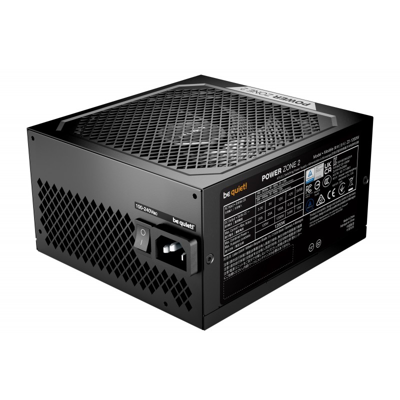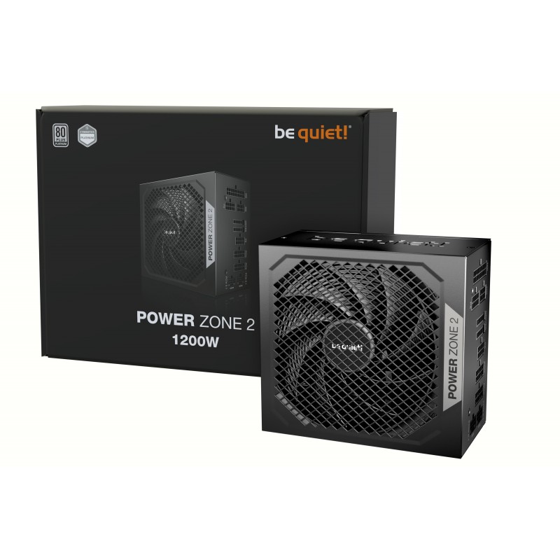 be quiet! POWER ZONE 2 1200 W | Alimentation ATX 3.1, 80 Plus Platinum. Puissance totale: 1200 W, Tension d'entrée AC: 100 - 240 V, Puissance de crête: 1270 W. Connecteur de la carte mère: 20+4 pin ATX, Longueur de câble d'alimentation de carte-mère: 60 cm, Longueur du câble d'alimentation SATA: 550,700,850,1000 mm. Utilité: PC, Facteur de forme de l'unité d'alimentation: ATX, Certification 80 PLUS: 80 PLUS Platinum. Couleur du produit: Noir, Type de refroidissement: Actif, Diamètre du ventilateur: 14 cm. Certificats de conformité: BSMI, CB, CCC, CE, Federal Communications Commission (FCC), RCM, RoHS, TÜV mark, UKCA, WEEE
