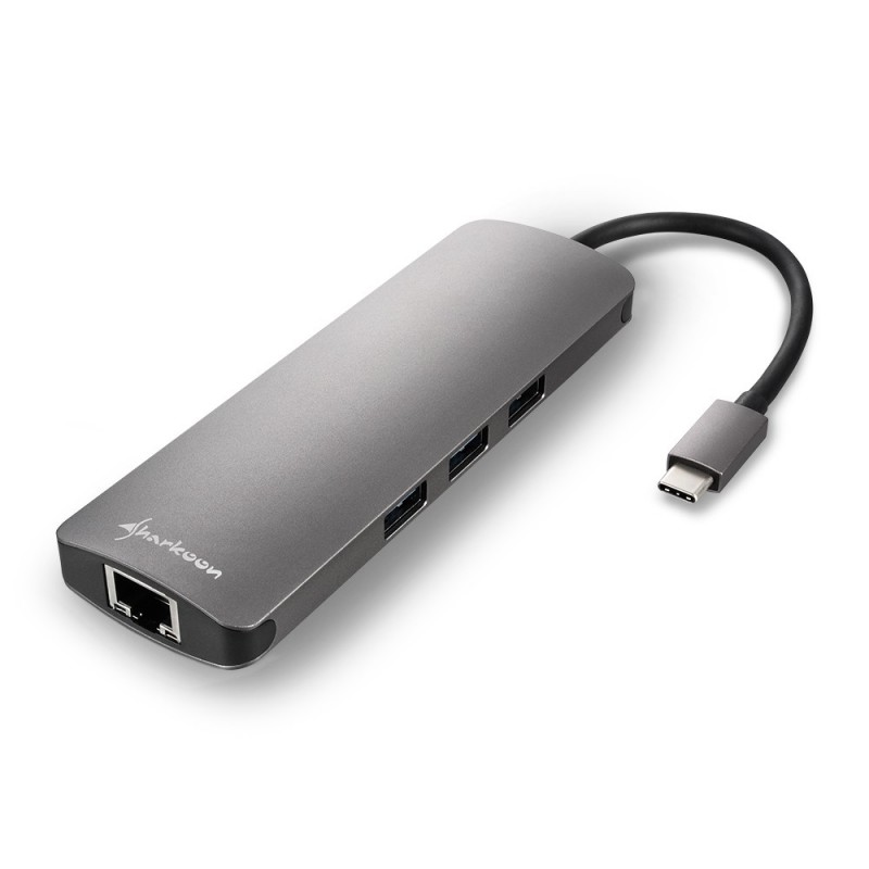 • Sharkoon USB 3.0 Type C Combo Adapter, USB Type-C, HDMI, RJ-45, USB 3.2 Gen 1 3.1 Gen 1, Gris, 132 m, 5 Gbits, 130 mm