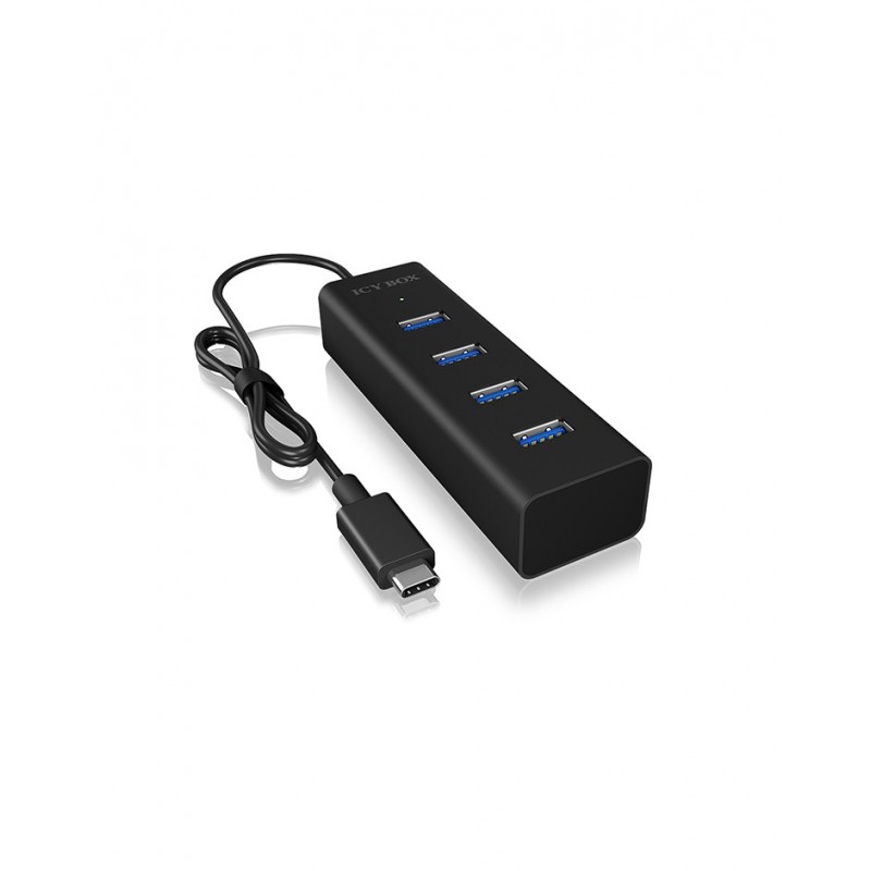 ICY BOX IB-HUB1409-C3. Interface de l'hôte: USB 3.2 Gen 1 (3.1 Gen 1) Type-C, Interfaces Hub: USB 3.2 Gen 1 (3.1 Gen 1) Type-A. Taux de transfert de données: 5000 Mbit/s, Couleur du produit: Noir, Matériau du boîtier/corps: Aluminium. Type d'alimentation d'énergie: USB. Prise en charge du système d'exploitation Mac: Mac OS 9.0, Mac OS 9.1, Mac OS 9.2, Mac OS X 10.0 Cheetah, Mac OS X 10.1 Puma, Mac OS X 10.10.... Largeur: 30 mm, Profondeur: 20 mm, Hauteur: 95 mm
