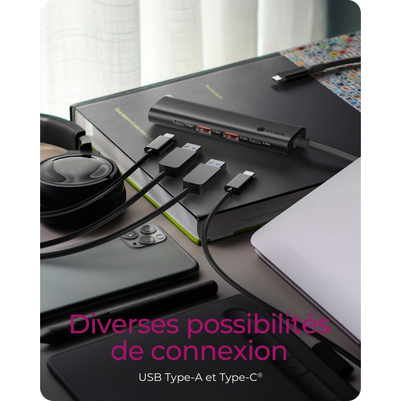 ICY BOX IB-HUB1437-CPD, Avec fil, USB 3.2 Gen 2 3.1 Gen 2 Type-C, 100 W, Noir, 10 Gbits, Aluminium, Plastique